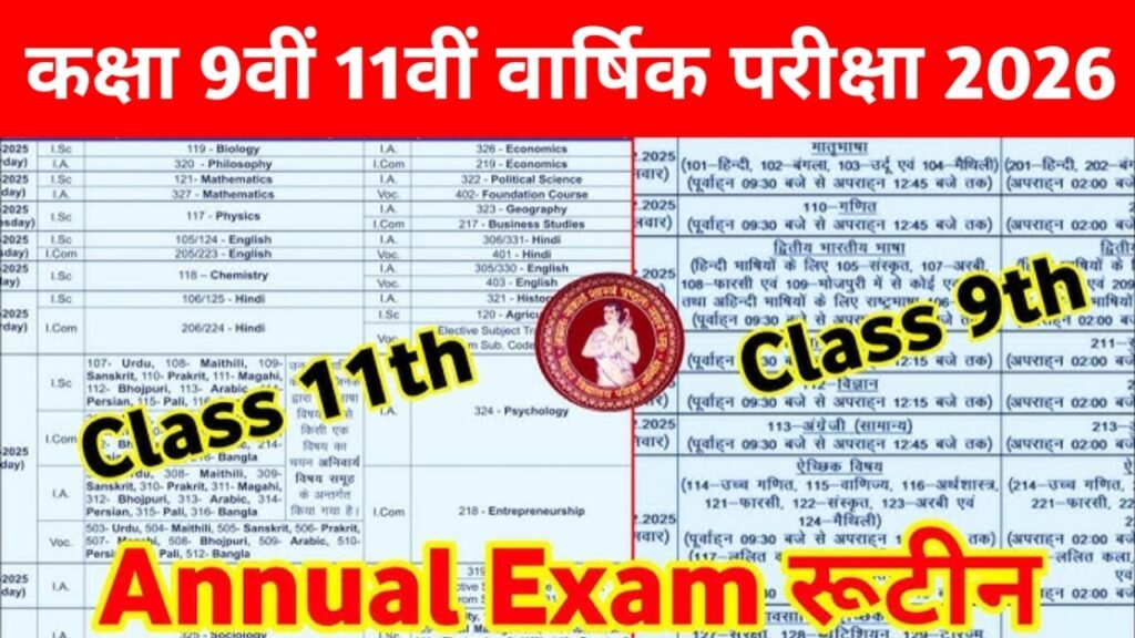 Bihar Board 9th 11th final Exam Time Table 2026 : बिहार बोर्ड से कक्षा 9 और कक्षा 11 में पढ़ाई कर रहे विद्यार्थियों का वर्ष 2026 के वार्षिक परीक्षा का समय सारणी दिनांक 6 मार्च को जारी कर दिया गया है ।