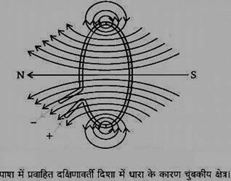 उत्तर:- 1. धारावाही चालक के चारों ओर चुंबकीय क्षेत्र की दिशा: मैक्सवेल का दक्षिण हस्त नियम