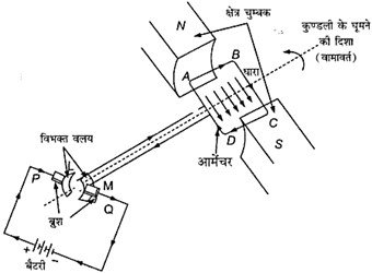 1. जब आर्मेचर कुंडली में विद्युत धारा प्रवाहित होती है, तो फ्लेमिंग के बाएँ हाथ के नियम के अनुसार इसकी भुजाओं पर विपरीत दिशा में बल लगता है।